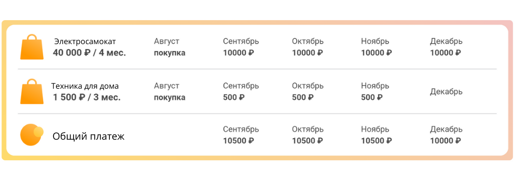 можно делать в бесплатную рассрочку. Сумма каждой такой покупки делится на равные части (по количеству месяцев рассрочки у партнёра). Раз в месяц «части» по всем покупкам суммируются